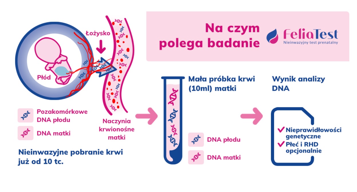 FeliaTest to nieinwazyjny prenatalny test genetyczny (NIPT), który pozwala ocenić ryzyko wystąpienia najczęstszych nieprawidłowości chromosomowych u płodu. Badanie przeznaczone jest dla kobiet w ciąży od 10. tygodnia, niezależnie od wieku i sposobu zapłodnienia (ciąża naturalna lub po in vitro).
